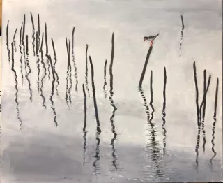 Noir et blanc - Oiseau sur un pieu fiché dans l'eau