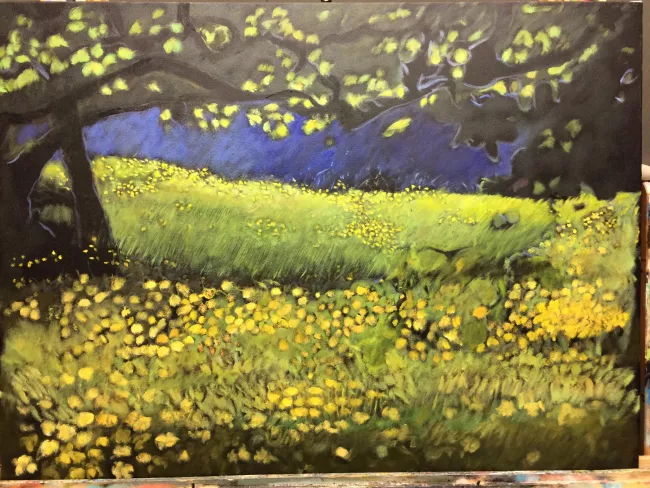 Boutons et aussi fleurs de pissenlit peints sur fond noir (leçon de Whistler). Date mai 2017 identifiant 228 Dimension 80x60,5