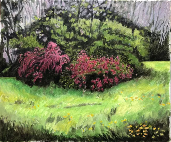 Par opposition à la toile précédente avec son éclairage ensoleillé, là j'ai essayé un temps plus sombre comme avant ou après la pluie.\n Date mai 2021 identifiant 430 Dimension 55x46