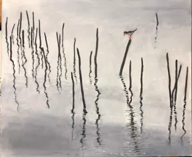 | Noir et blanc - Oiseau sur un pieu fiché dans l'eau |