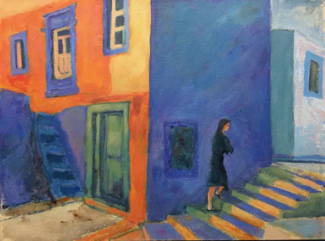 Femme qui monte des escaliers dans l'ile de Kalymnos