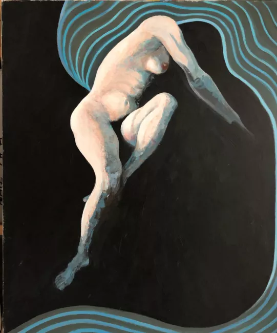 Femme nue assise sa chevelure se confond avec le fond noir + lignes bleues "toscane"